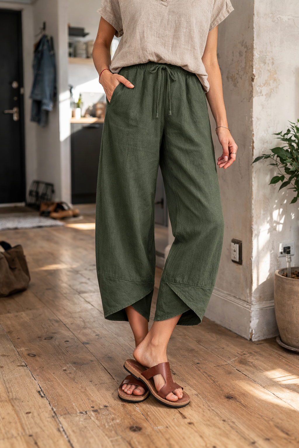 - Długość 3/4: Stylowa długość 3/4 zapewnia chłód, oferując jednocześnie modny wygląd, który dobrze komponuje się z różnym obuwiem.