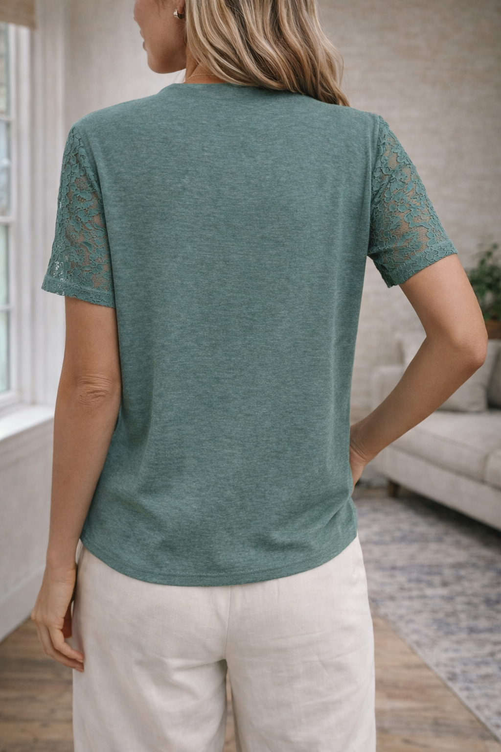 Odkryj idealne połączenie komfortu i kobiecego wdzięku dzięki naszej damskiej bluzce z dekoltem w serek i koronkowymi rękawami. Wykonana z dbałością o detale, z wykwintnymi koronkowymi zdobieniami na rękawach, ta bluzka doda wyjątkowego charakteru Twojej codziennej garderobie, czyniąc ją obowiązkową pozycją na każdą okazję.