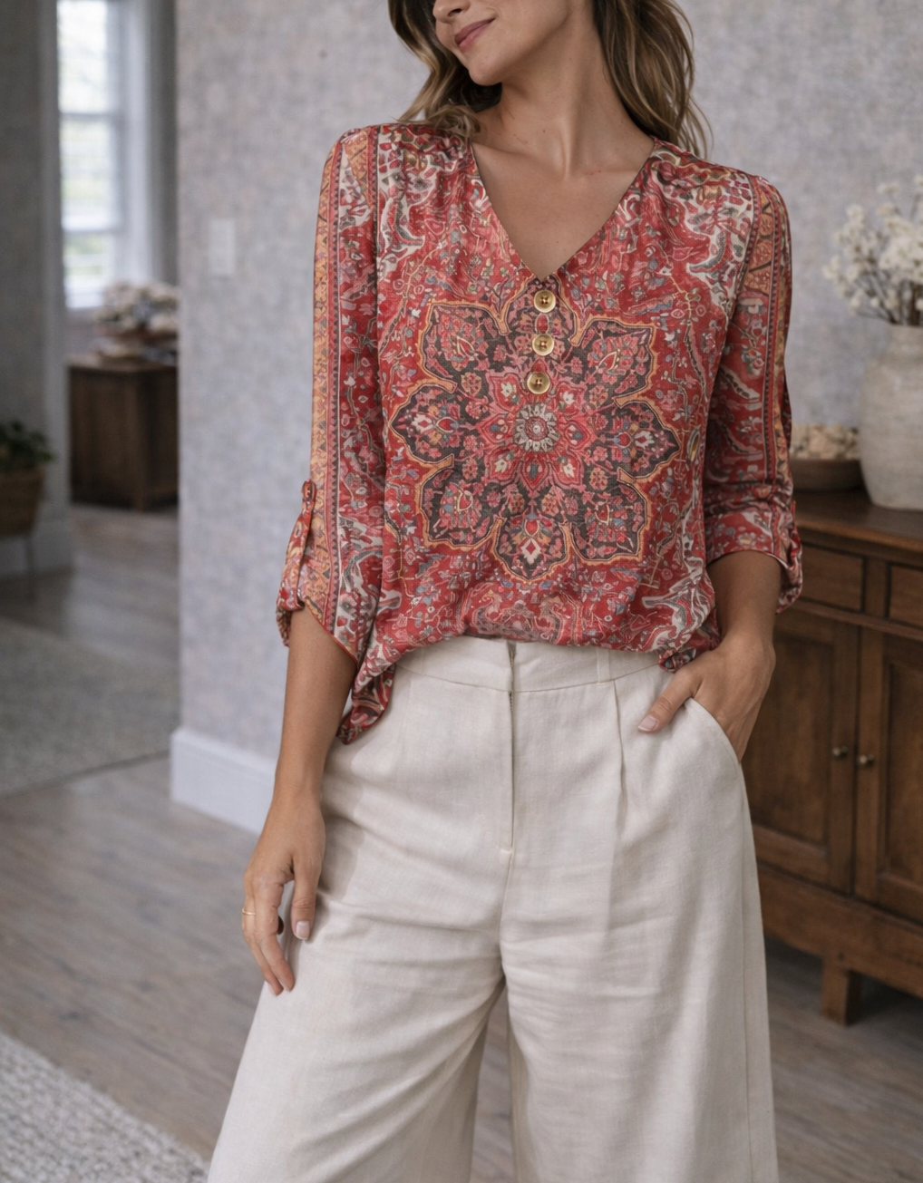 Uzupełnij swoją garderobę tą bluzką z nadrukiem i dekoltem w serek, zaprojektowaną z luźnym krojem i stylowymi rękawami 3/4. Wzory inspirowane stylem boho czynią ją wszechstronnym elementem na każdą okazję, płynnie przechodzącym od swobodnych dni do świątecznych wieczorów.