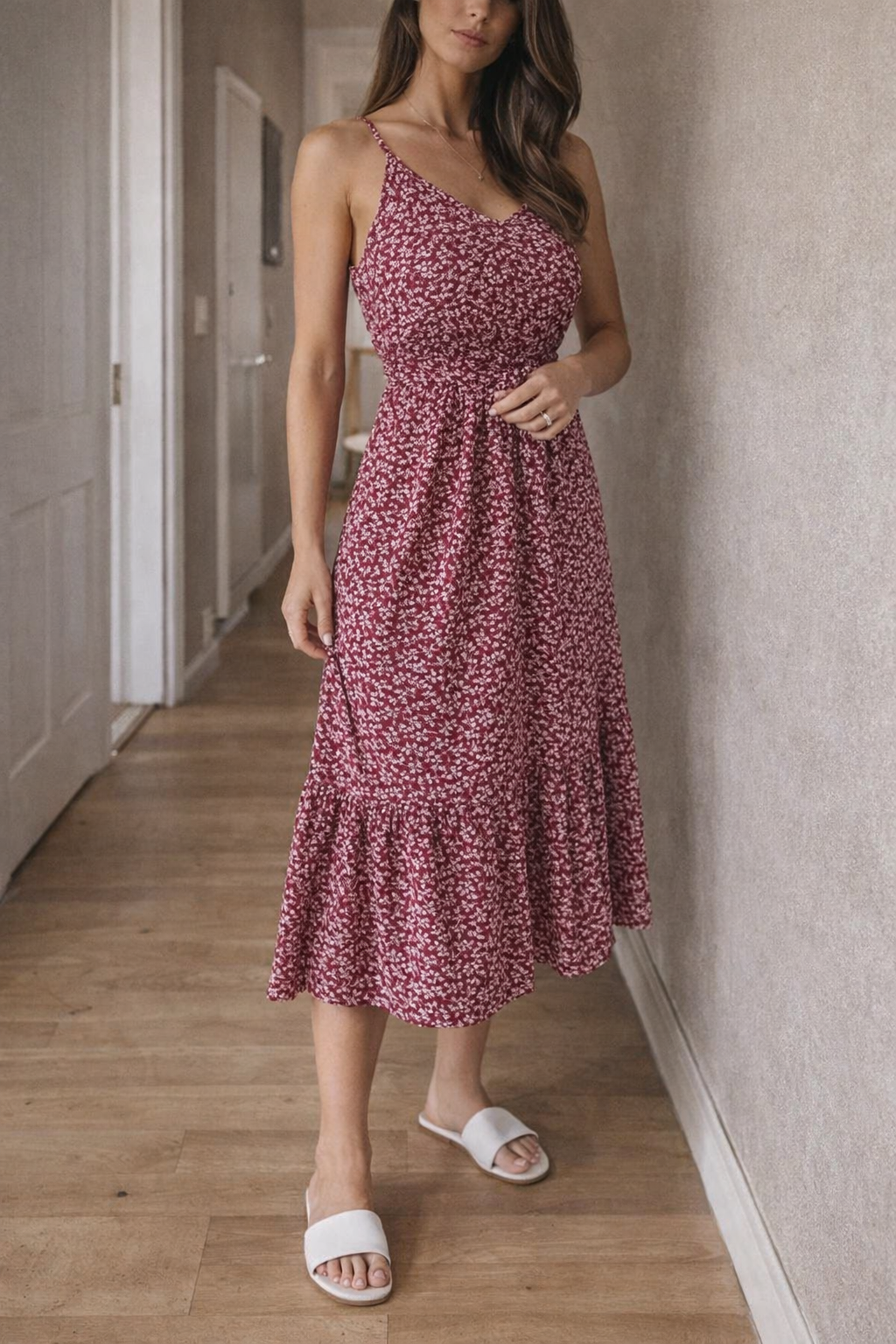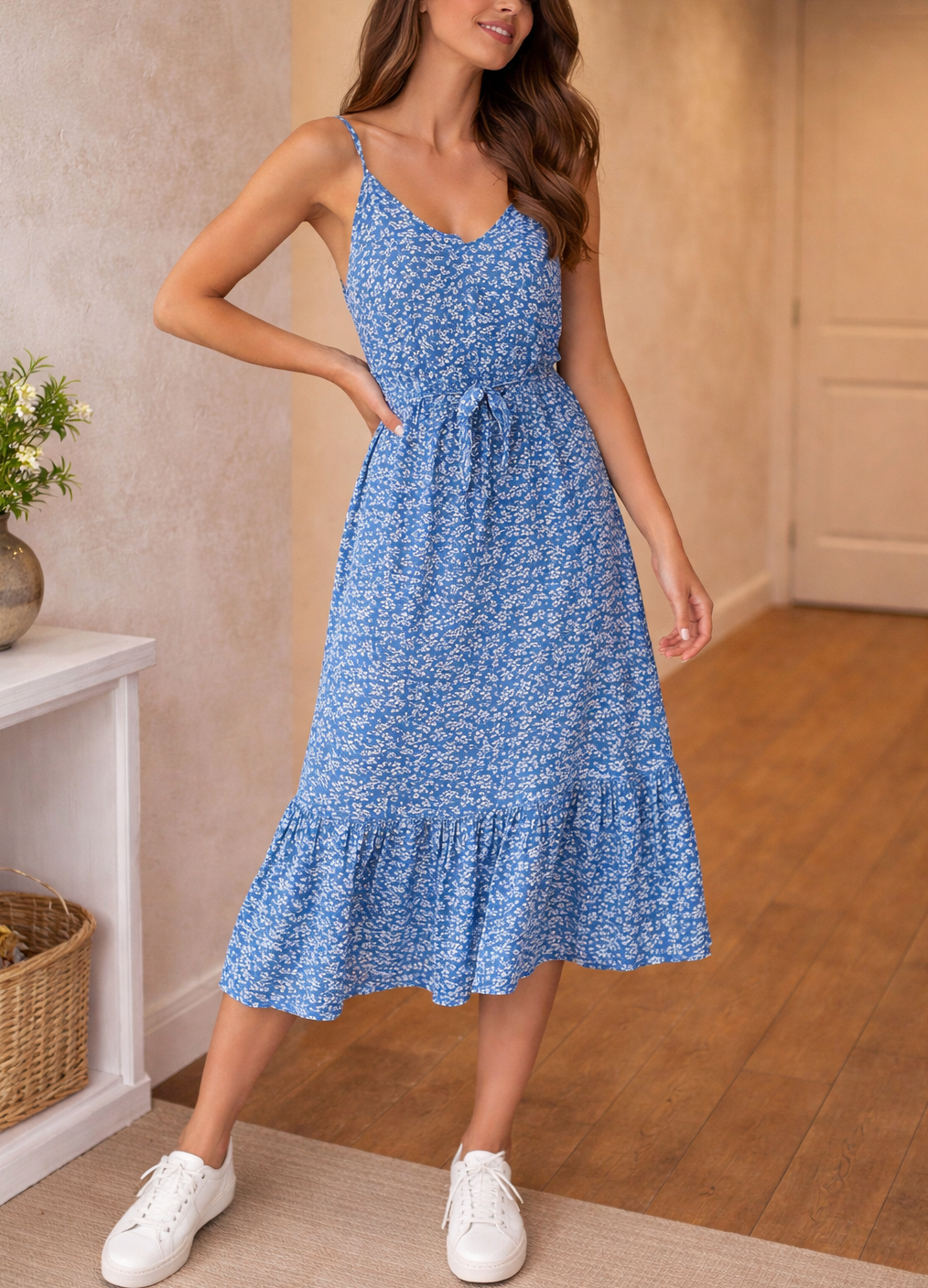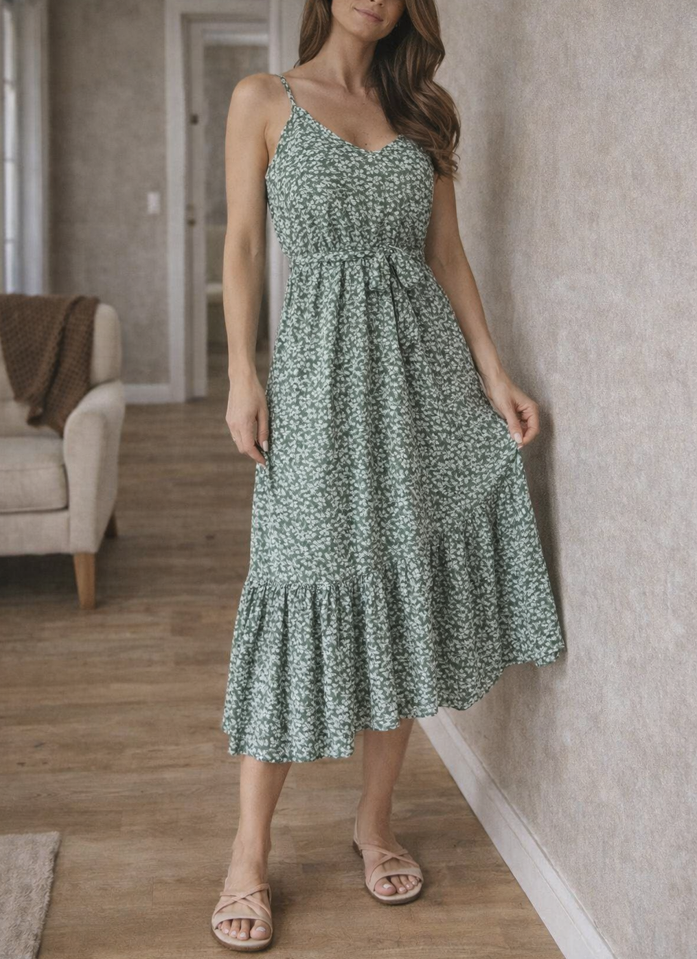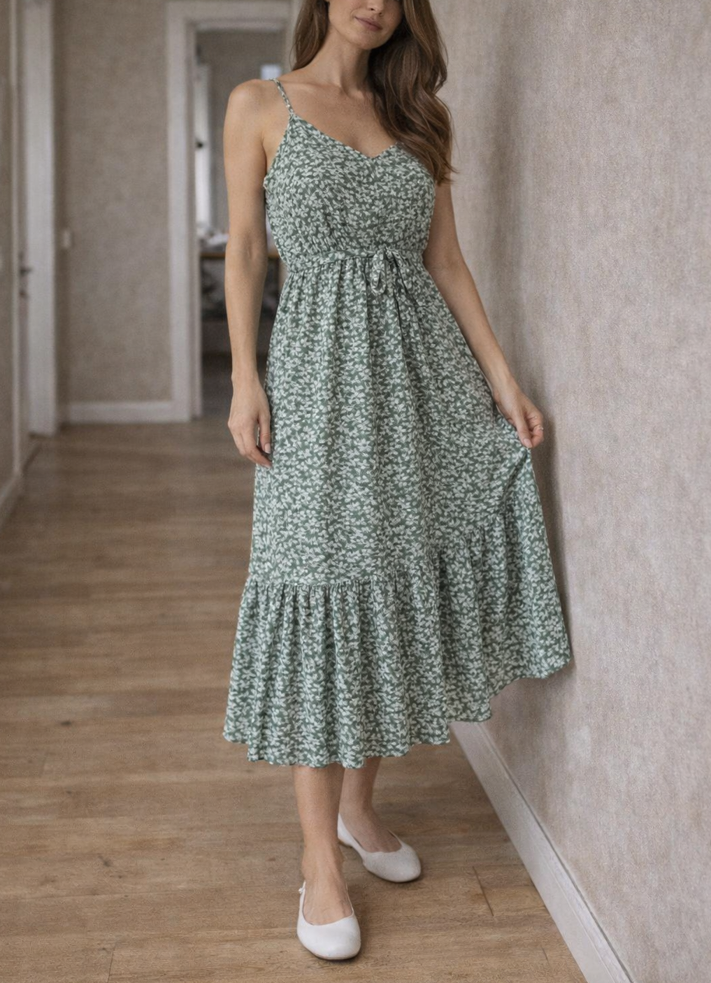 Ta kwiecista sukienka midi to idealne połączenie stylu i komfortu, dzięki czemu jest niezbędnym elementem Twojej wiosennej i letniej garderoby. Z korzystnym dekoltem w serek i figlarnym falbankowym dołem, ta sukienka oferuje uroczy fason, który nadaje się na różne okazje, od niezobowiązujących wyjść po randki.