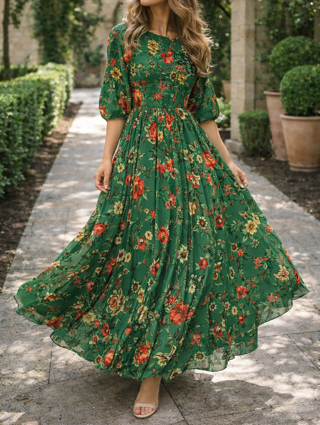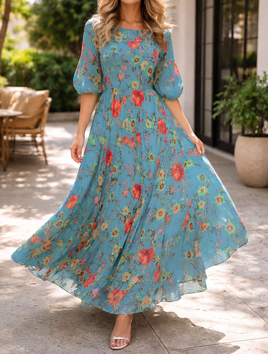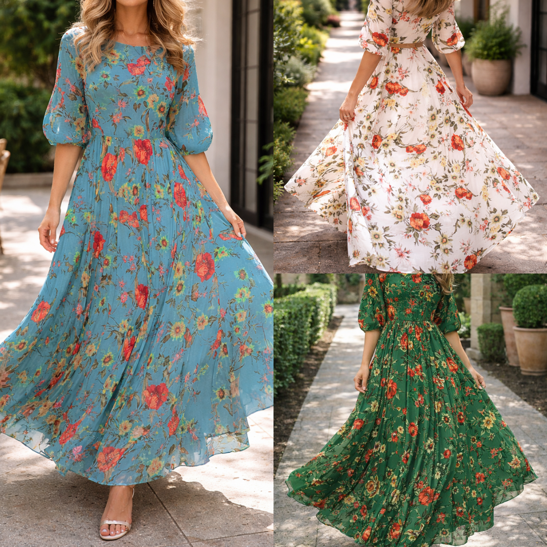 Ta sukienka maxi w kwiaty charakteryzuje się zwiewną sylwetką w kształcie litery A, zaprojektowaną z myślą o komforcie i stylu, dzięki czemu jest idealnym wyborem na niezobowiązujące wyjścia i specjalne okazje. Okrągły dekolt i rękawy 3/4 oferują wszechstronny wygląd, który można łatwo wystylizować na elegancko lub na co dzień.