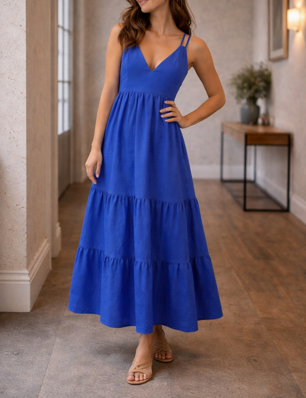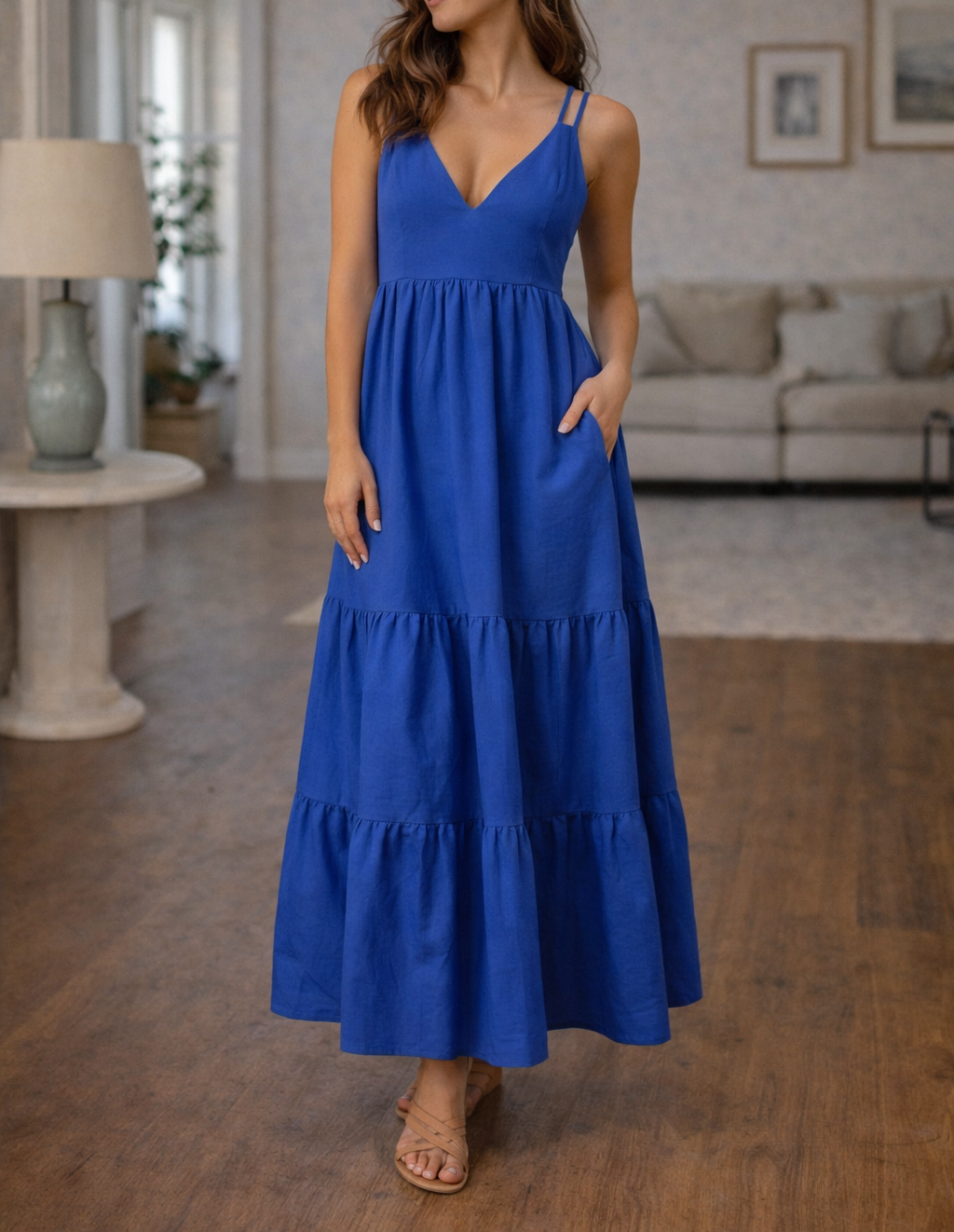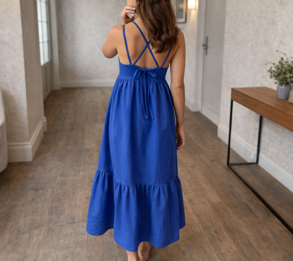 Ta oszałamiająca sukienka maxi bez rękawów charakteryzuje się korzystnym krojem w kształcie litery A i eleganckim dekoltem w serek, dzięki czemu jest idealnym wyborem na ciepłe, słoneczne dni i niezobowiązujące wyjścia. Jej uniwersalny styl z łatwością przechodzi z dnia w noc, pozwalając na tworzenie wielu stylizacji bez wysiłku.