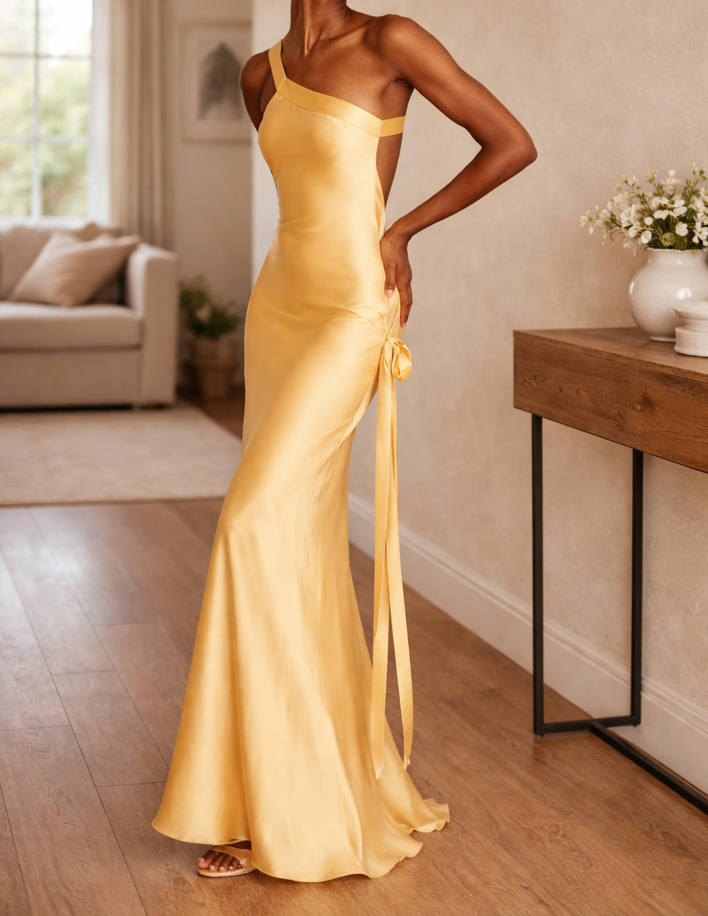 Wejdź w świat elegancji dzięki tej oszałamiającej sukience maxi na jedno ramię, zaprojektowanej, aby przyciągać wzrok na każdym wydarzeniu. Jej odkryte plecy dodają odrobinę powabu, dzięki czemu idealnie nadaje się na specjalne okazje, na których chcesz zabłysnąć.