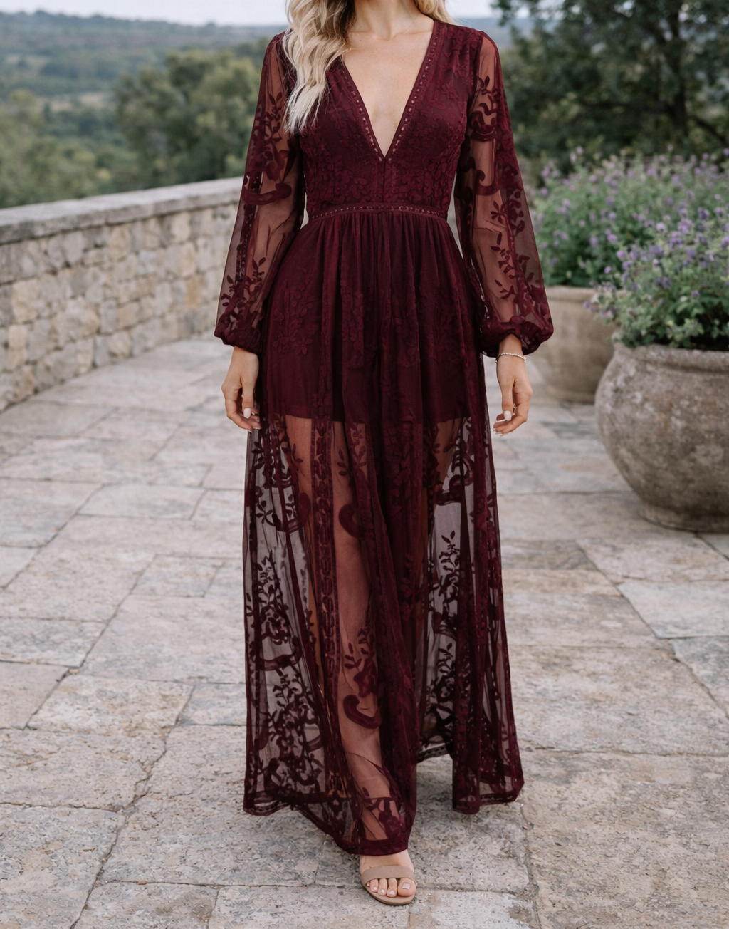Ta wyjątkowa sukienka maxi z koronki łączy elegancję i swobodny styl boho, dzięki czemu wyróżnia się na każdą okazję. Z długimi rękawami i uwodzicielskim dekoltem w serek, ta sukienka nie tylko wygląda oszałamiająco, ale także zapewnia wygodne dopasowanie na cały dzień.