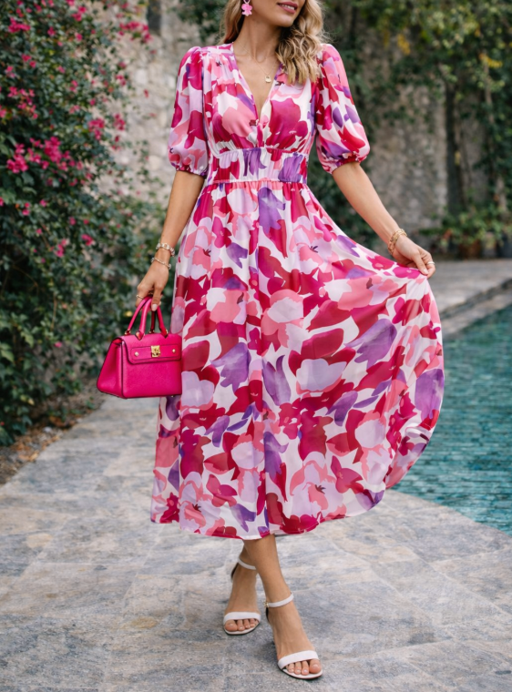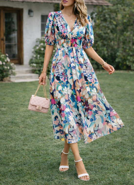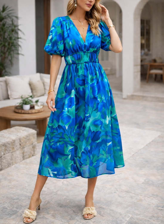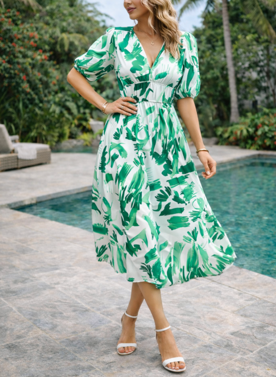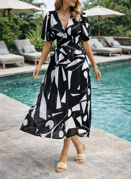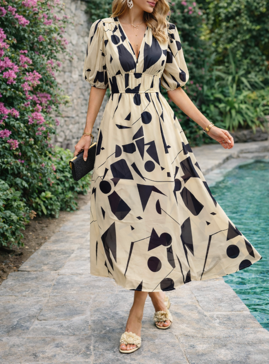 Poczuj ponadczasową elegancję dzięki naszej damskiej sukience midi z dekoltem w serek, o kroju litery A, z bufiastymi rękawami i abstrakcyjnym wzorem. Ta wszechstronna sukienka idealnie sprawdzi się na każdą okazję, stanowiąc niezbędny element Twojej garderoby.