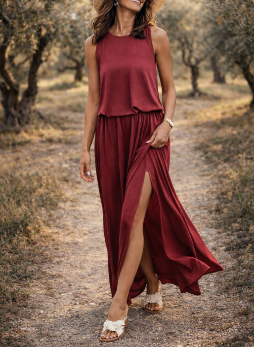 Ulepsz swoją garderobę dzięki tej sukience maxi bez rękawów, zaprojektowanej z myślą o swobodnym stylu i komforcie. Charakteryzuje się szykownym rozcięciem i dopasowaną elastyczną talią, dzięki czemu ten swobodny model idealnie nadaje się na słoneczny dzień lub specjalną okazję.