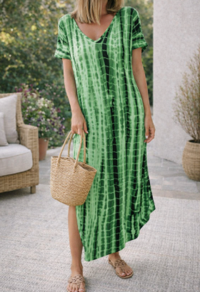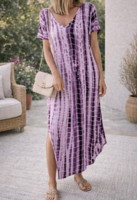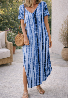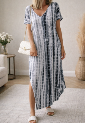 Ta oszałamiająca sukienka maxi charakteryzuje się korzystnym dekoltem w serek i uroczym wzorem tie-dye, dzięki czemu wyróżnia się w każdej garderobie. Idealna na niezobowiązujące wyjścia lub dni na plaży, jej krótkie rękawy i rozcięcie z boku dodają odrobinę figlarnej elegancji, którą pokochasz.