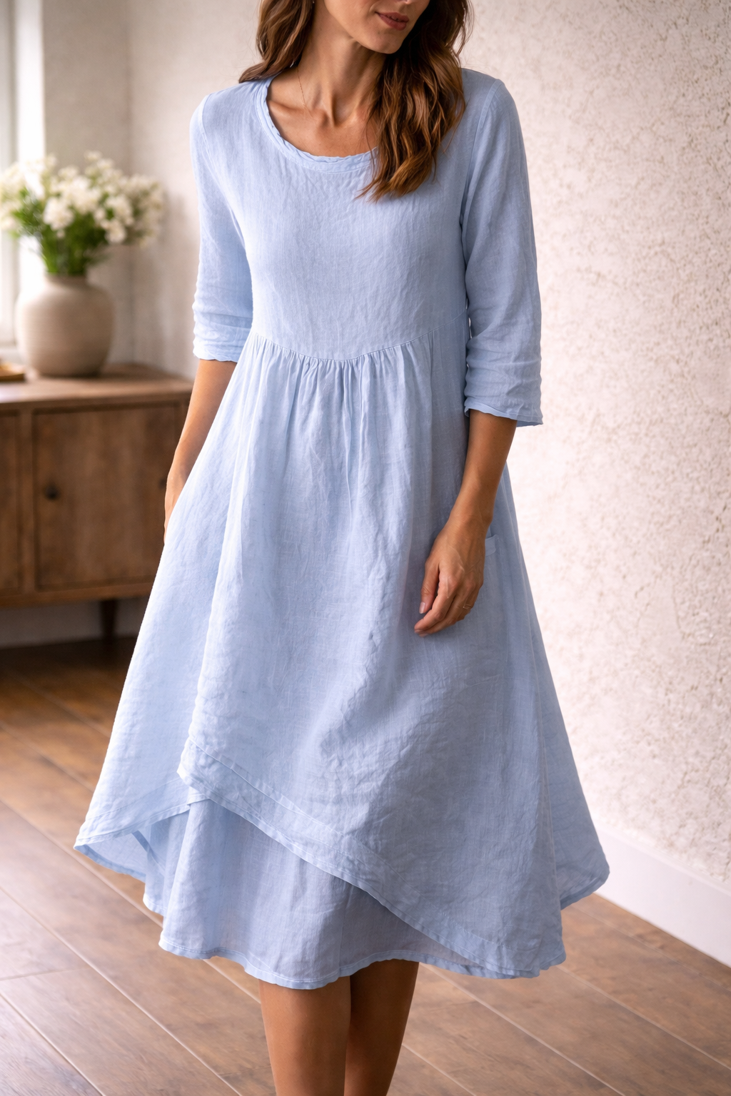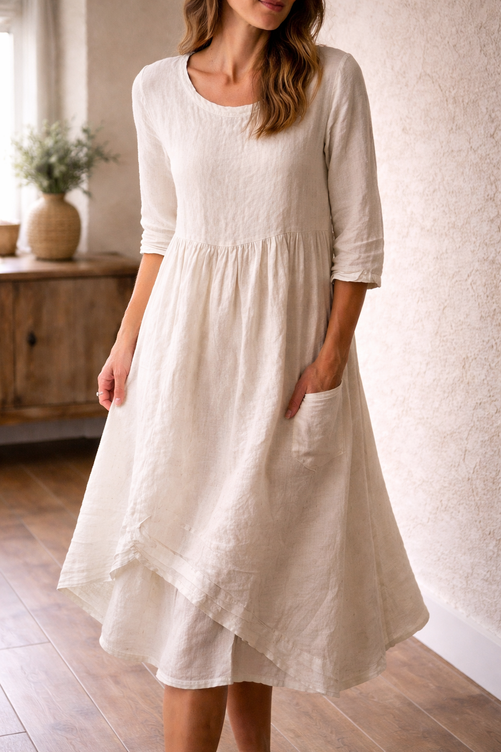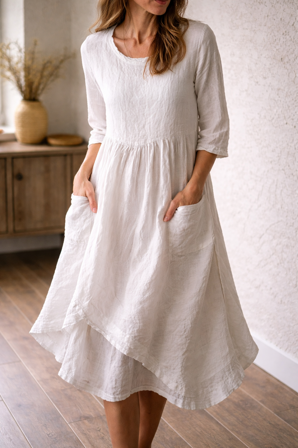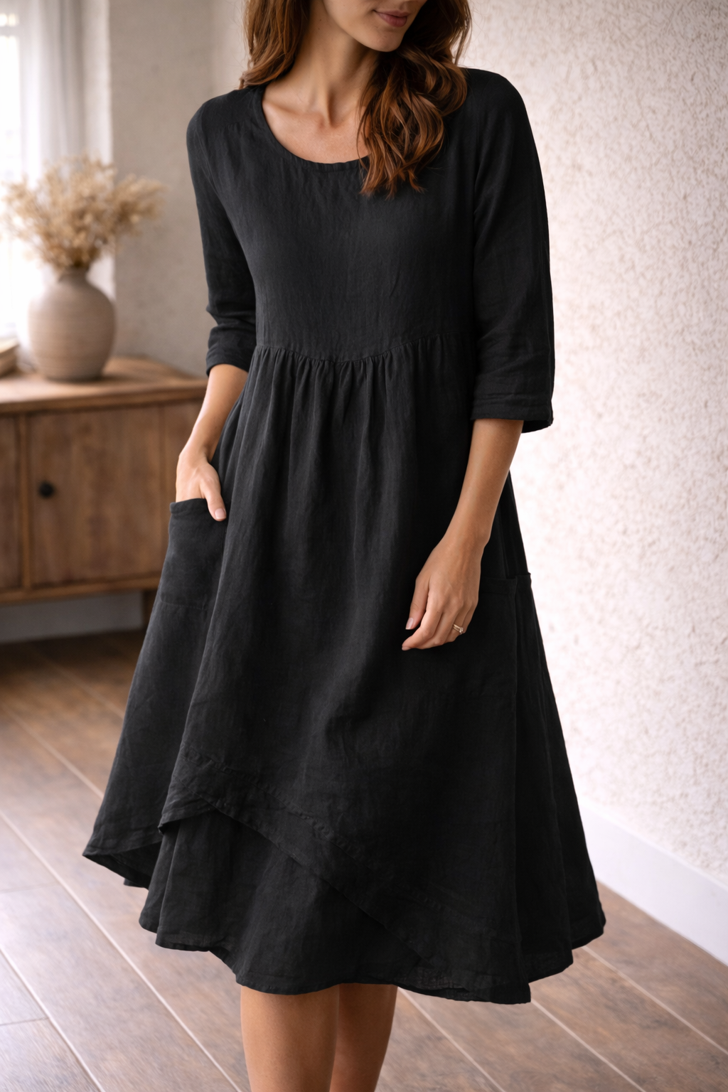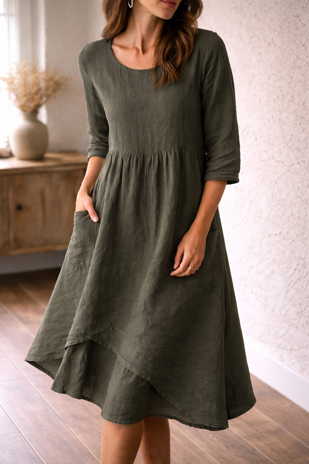 Ta oszałamiająca sukienka midi o kroju litery A została zaprojektowana z myślą o najwyższym komforcie i swobodnym stylu. Posiada rękawy 3/4 i korzystny krój, dzięki czemu idealnie nadaje się na ciepłe dni i płynnie przechodzi od niezobowiązujących wyjść do bardziej formalnych okazji.