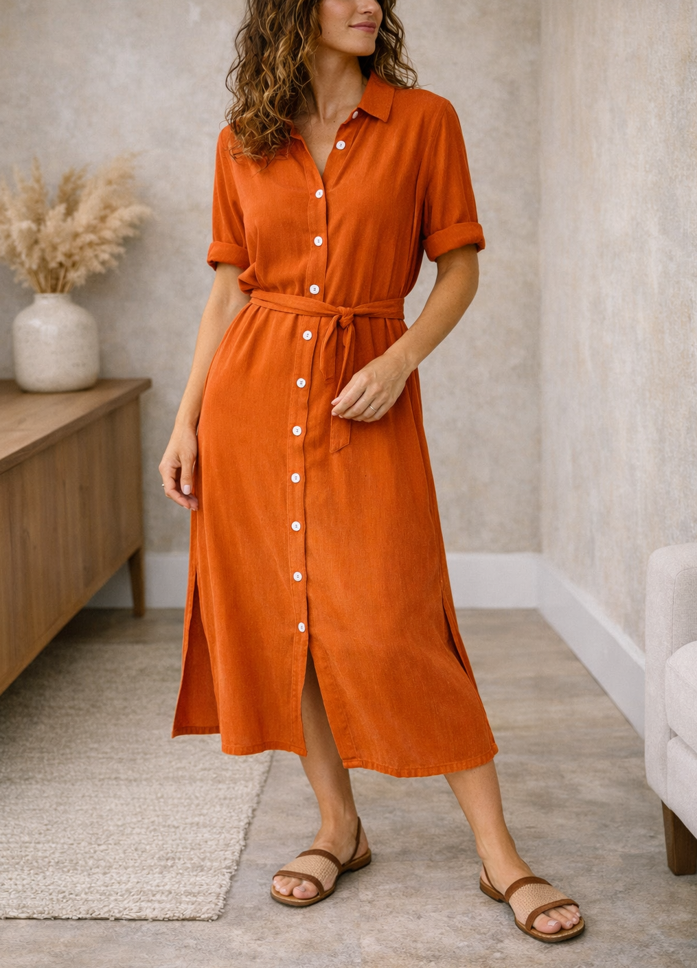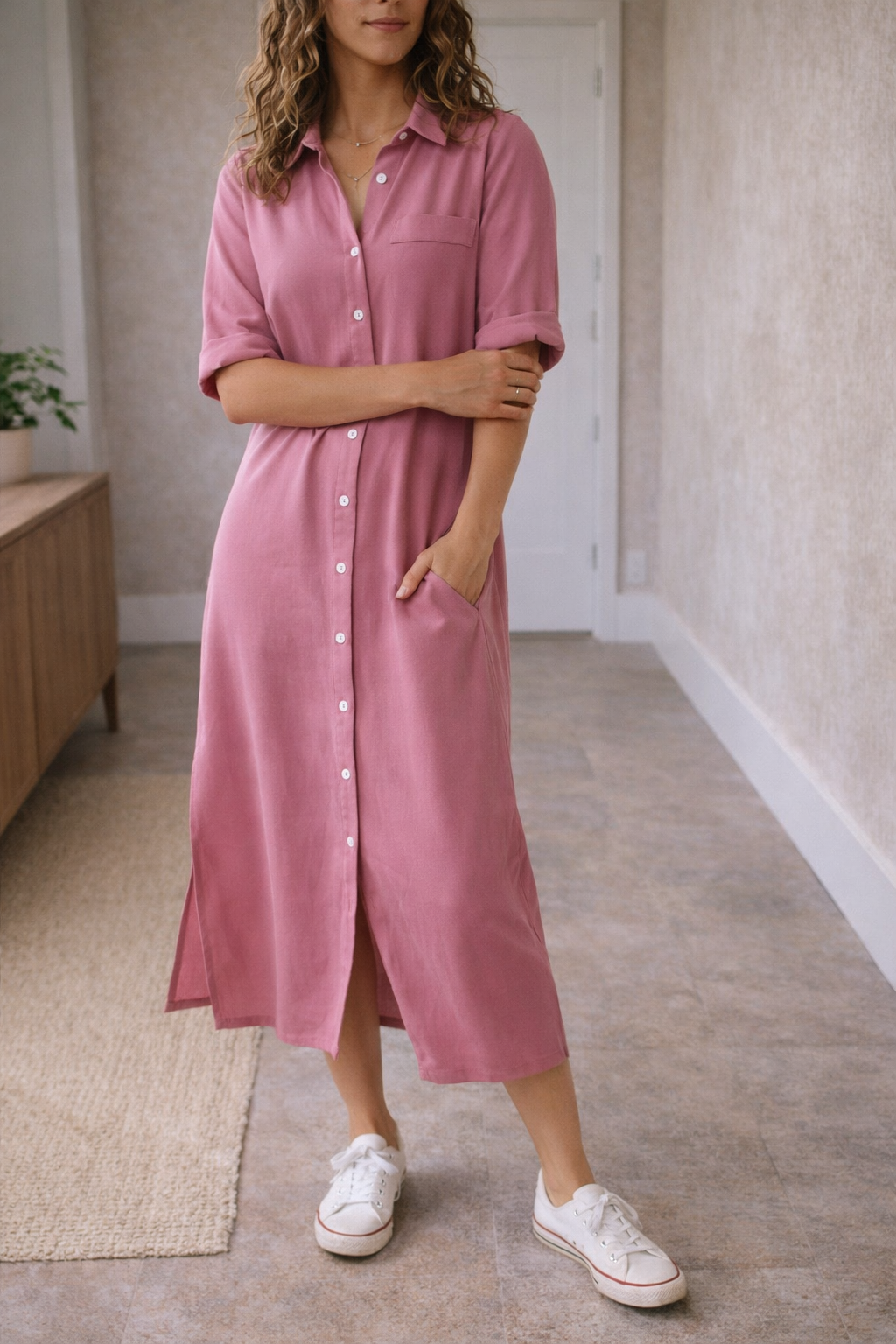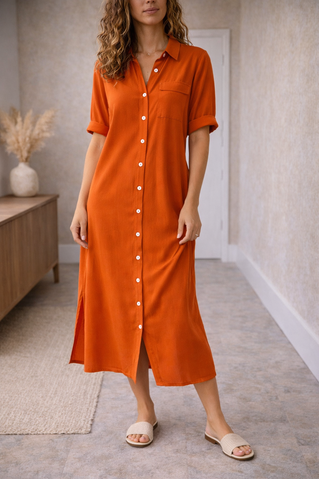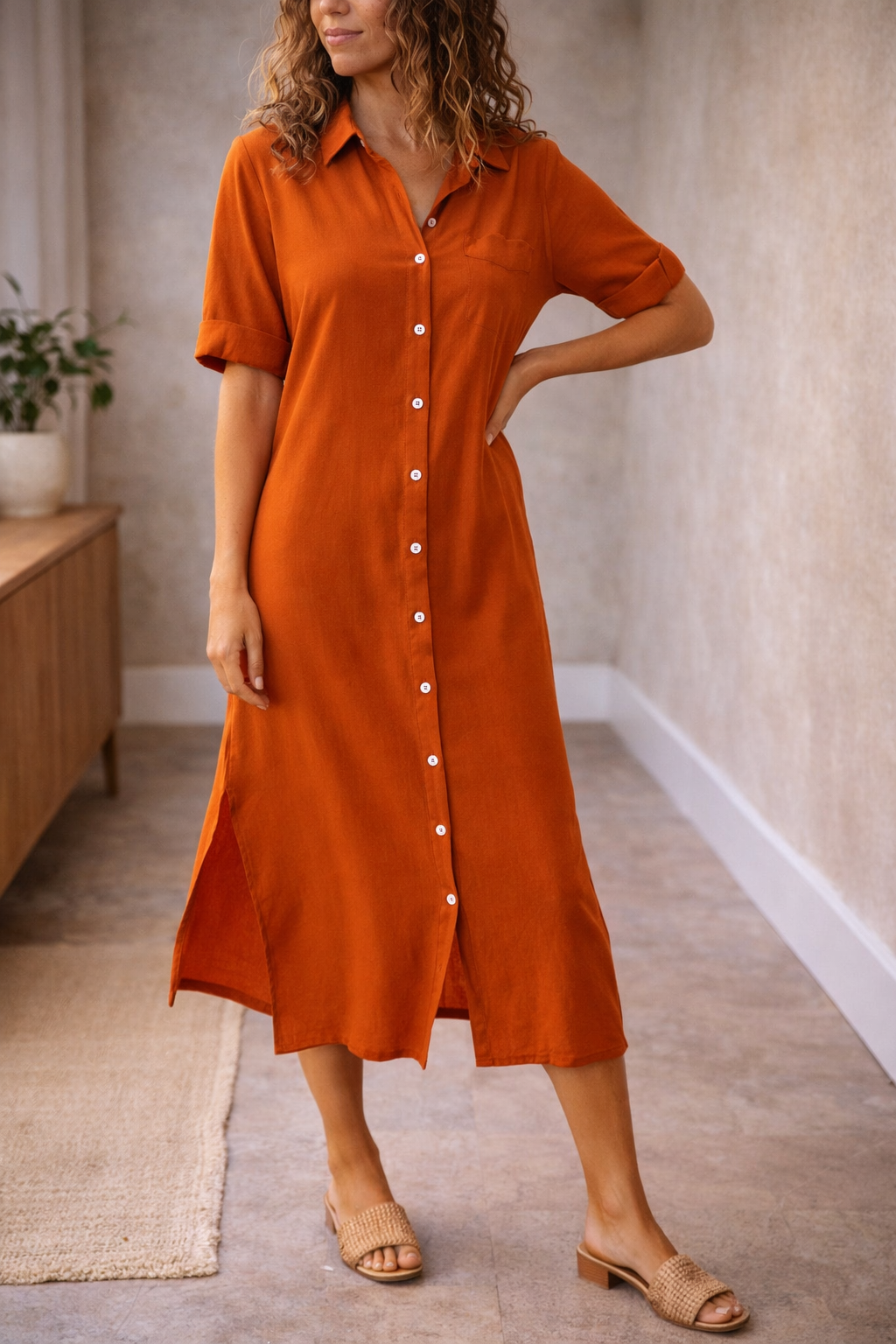 Ta damska sukienka midi zapinana na guziki łączy w sobie wygodę i styl, dzięki czemu nadaje się zarówno na niezobowiązujące wyjścia, jak i bardziej eleganckie wydarzenia. Z krótkimi rękawami i klasycznym kołnierzykiem, ta sukienka koszulowa zapewnia świeży wygląd, który z łatwością przechodzi z dnia w noc.