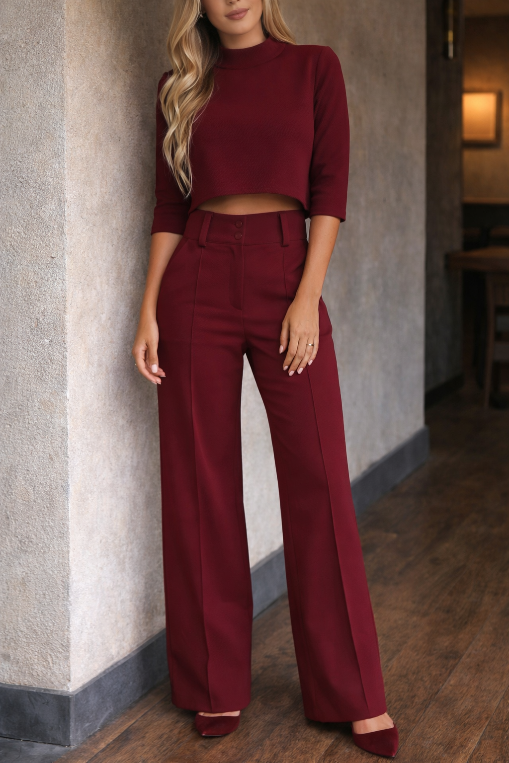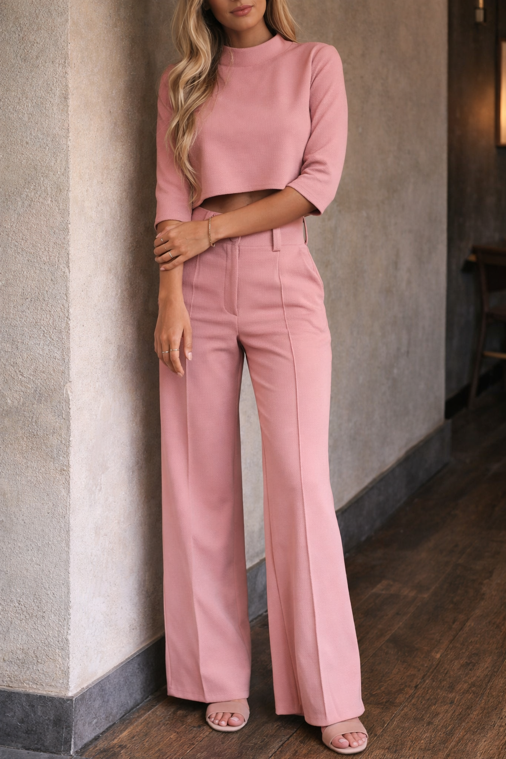 Ten oszałamiający dwuczęściowy zestaw składa się z modnego crop topu i spodni z szerokimi nogawkami z wysokim stanem, idealnych do bezproblemowego ulepszenia Twojej garderoby. Swobodny krój i elegancka sylwetka sprawiają, że jest to idealny wybór zarówno na niezobowiązujące wyjścia, jak i bardziej formalne spotkania.