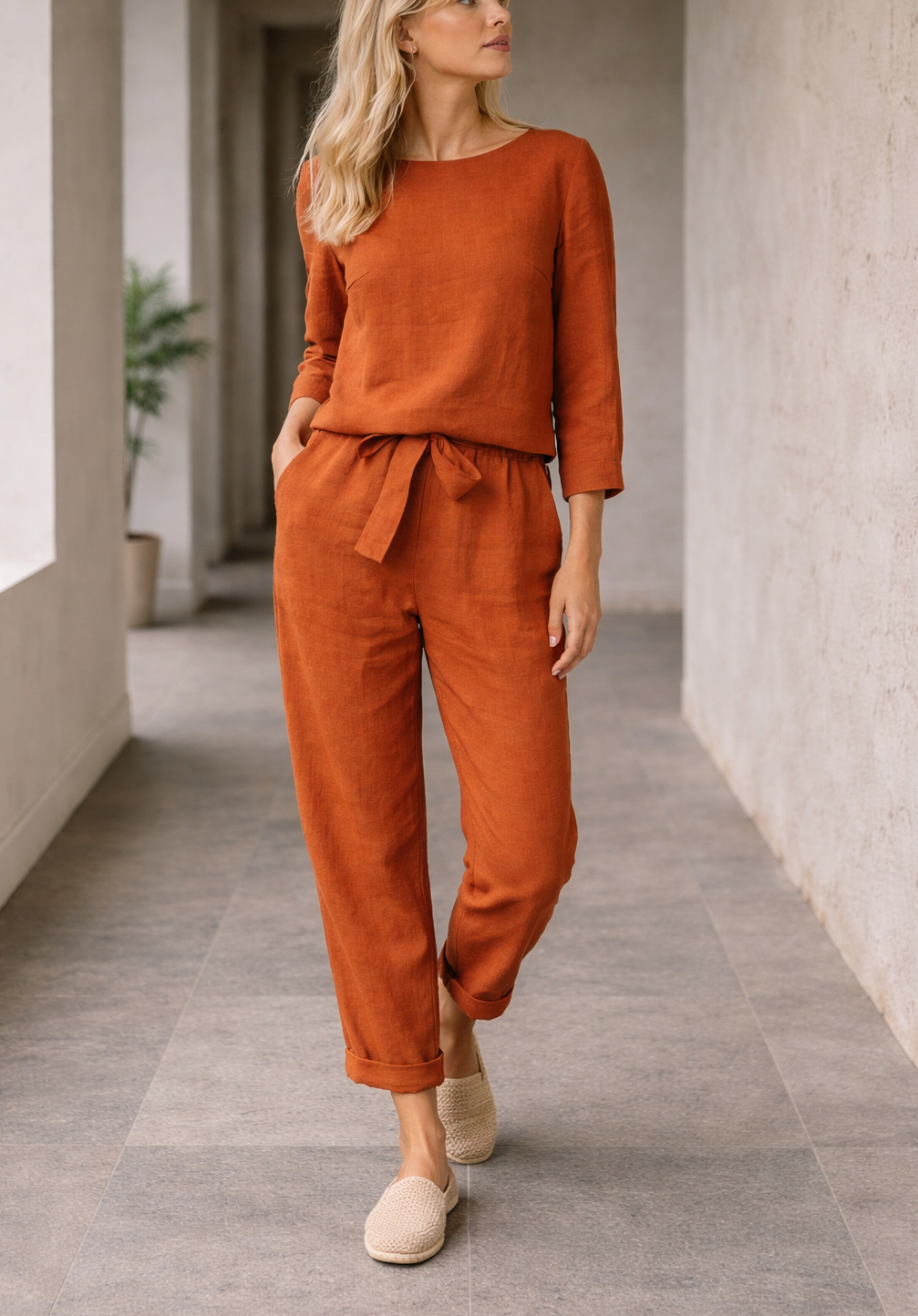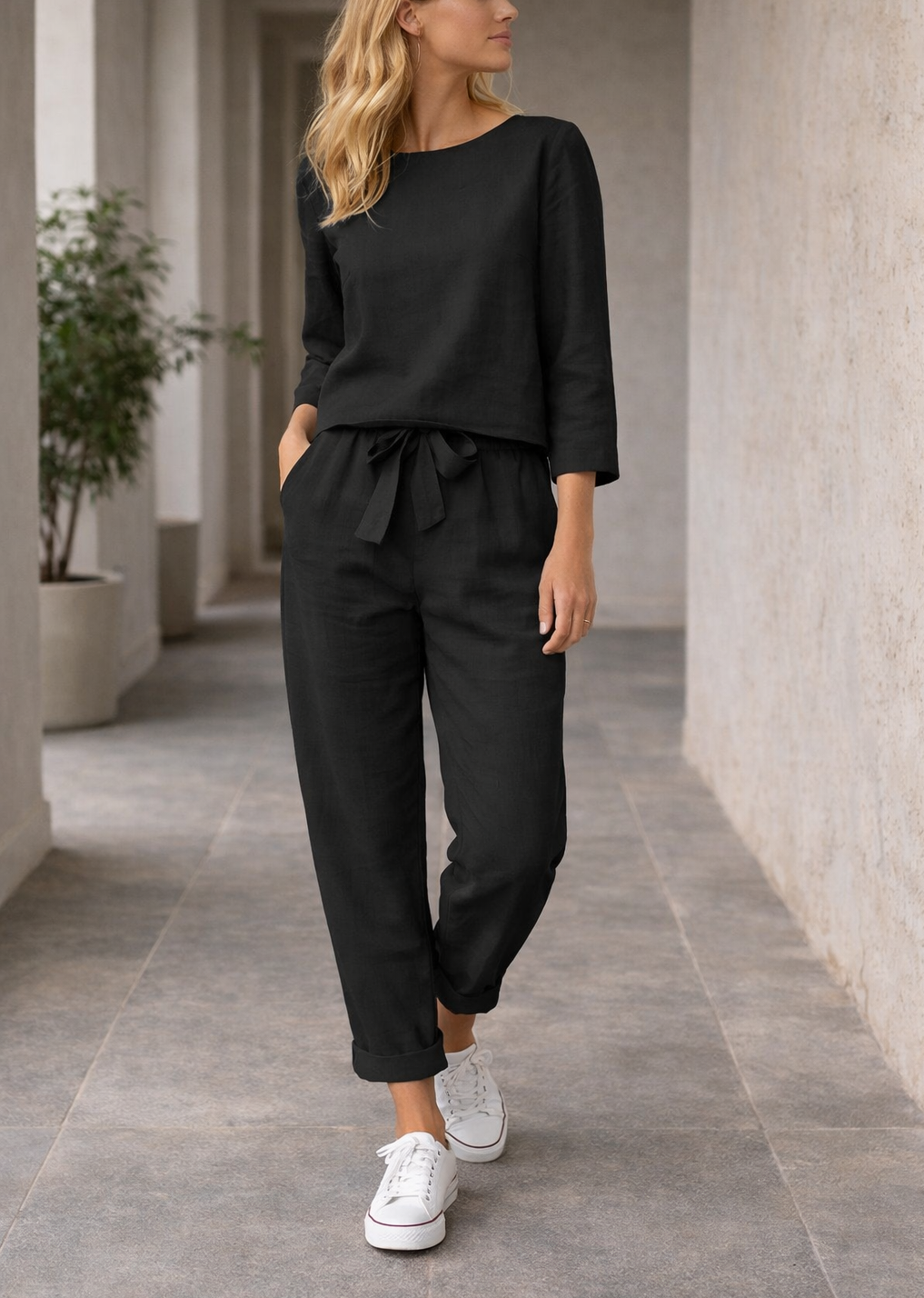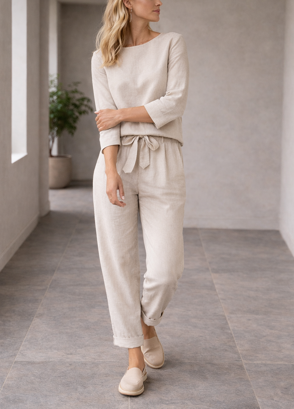 Ten szykowny dwuczęściowy komplet spodni został zaprojektowany z myślą o nowoczesnej kobiecie. Charakteryzuje się luźnym krojem, bluzką z długim rękawem i stylowymi spodniami z wiązaniem w pasie. Idealny na ciepłe dni, ten skoordynowany strój płynnie łączy komfort z wyrafinowaniem, dzięki czemu jest wszechstronnym wyborem zarówno na niezobowiązujące wyjścia, jak i relaksujące spotkania.